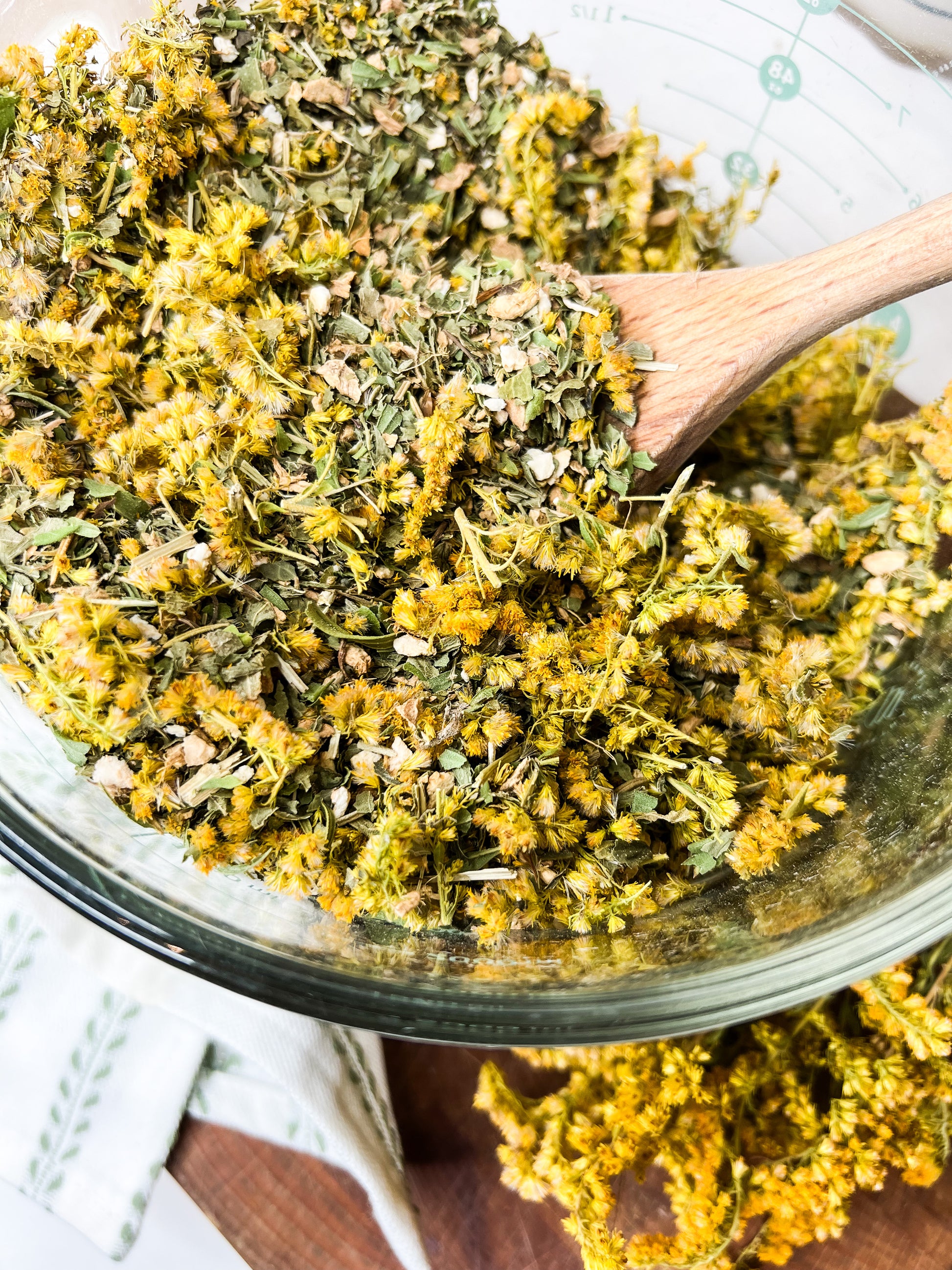 Enhance your quality of life with our loose leaf tea Allergy-Ease, carefully crafted with a blend of organic ingredients such as Goldenrod, Nettle, Ginger, Lemon Peel, Echinacea, Rosemary, and Thyme. Experience the medicinal benefits of these powerful herbs and breathe easy once again.
